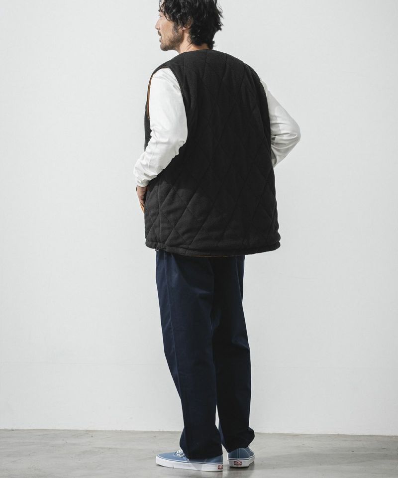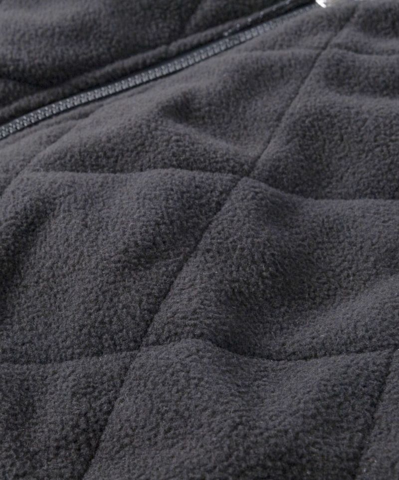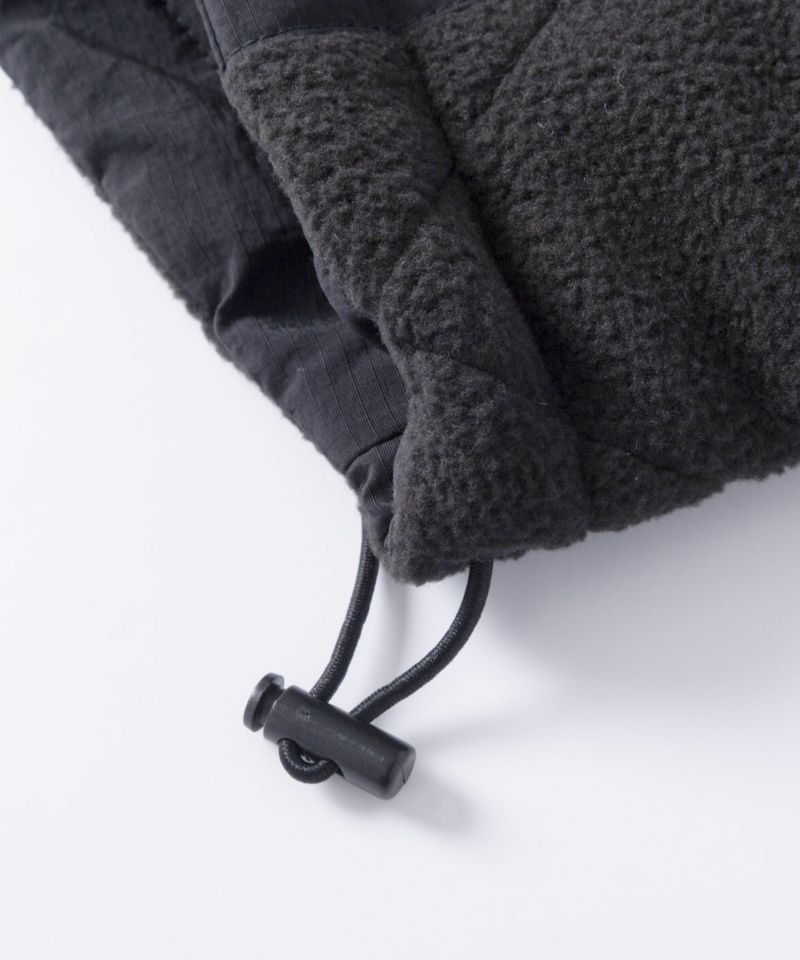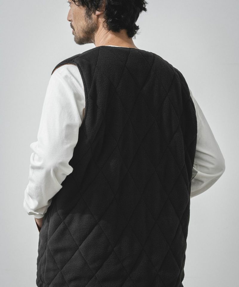 ナイロン素材を使用した表面とフリース素材にダイヤ柄のキルティングが施された裏側の印象が異なるリバーシブル仕様。
