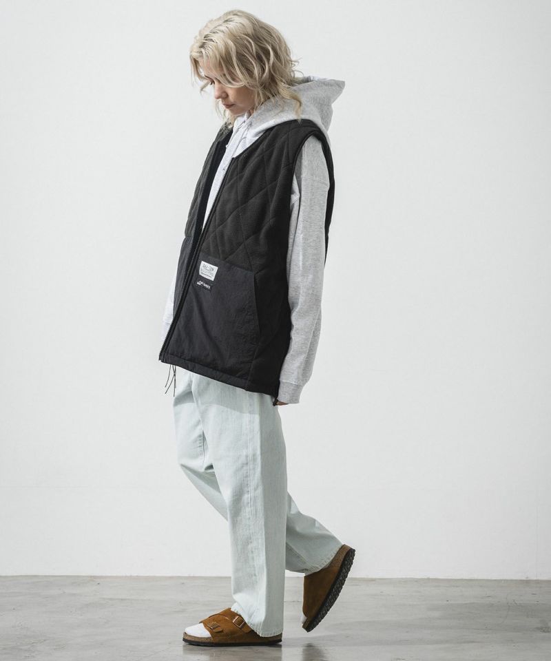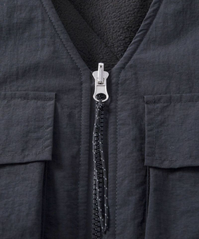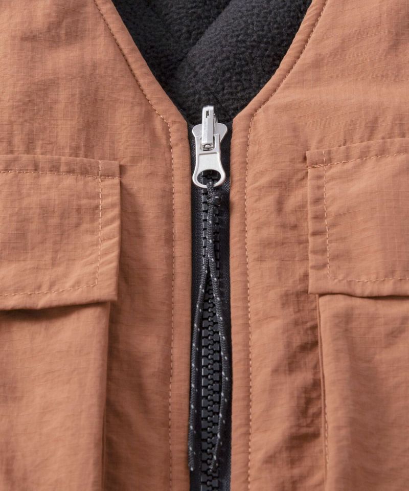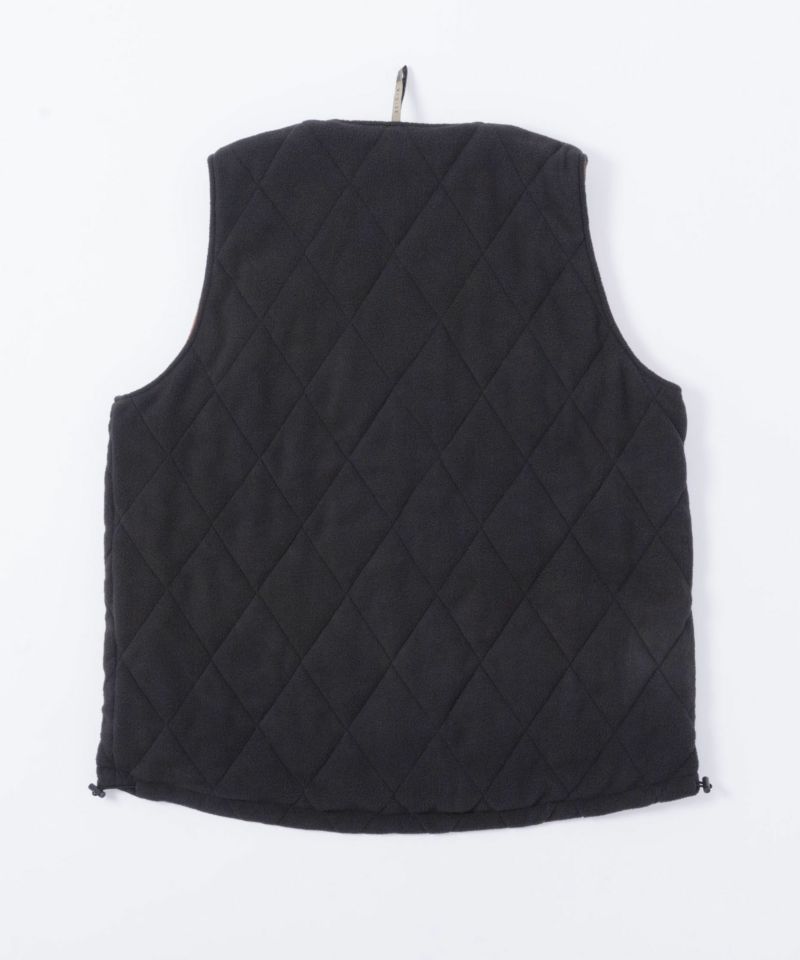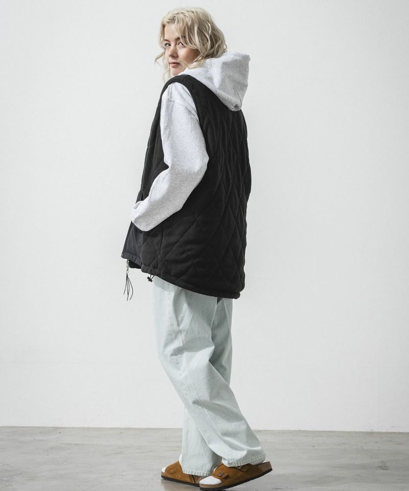 ナイロン素材を使用した表面とフリース素材にダイヤ柄のキルティングが施された裏側の印象が異なるリバーシブル仕様。